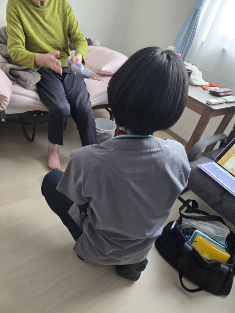 お話をするときは、必ず入居者様の目線よりも低い位置にしゃがみ、 しっかりと目を合わせて、ゆっくりと対話を重ねます。 それは、私たちが「寄り添うケア」を何よりも大切にしている証拠です。