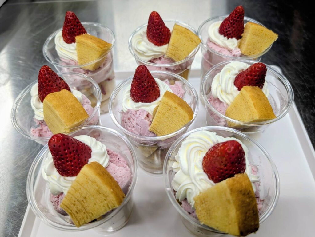 今回の特製デザートは、 ・大ぶりのいちご ・しっとりバームクーヘン ・いちごアイス ・ふわふわ生クリーム という、見た目も華やかな春のごちそうパフェ。